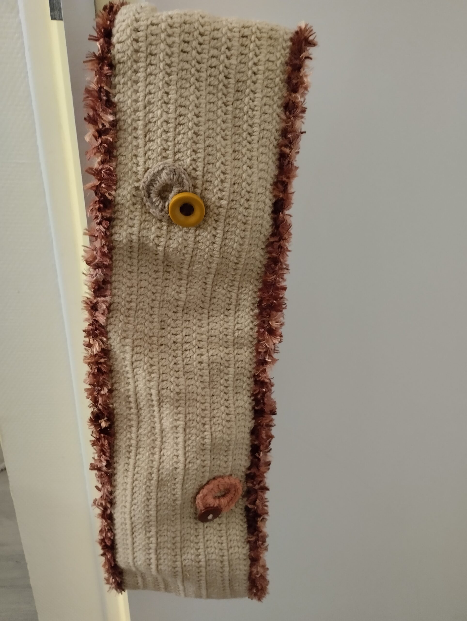 écharpe de laine beige design « Hortensia » décorée de macarons et de boutons-finie au polyester